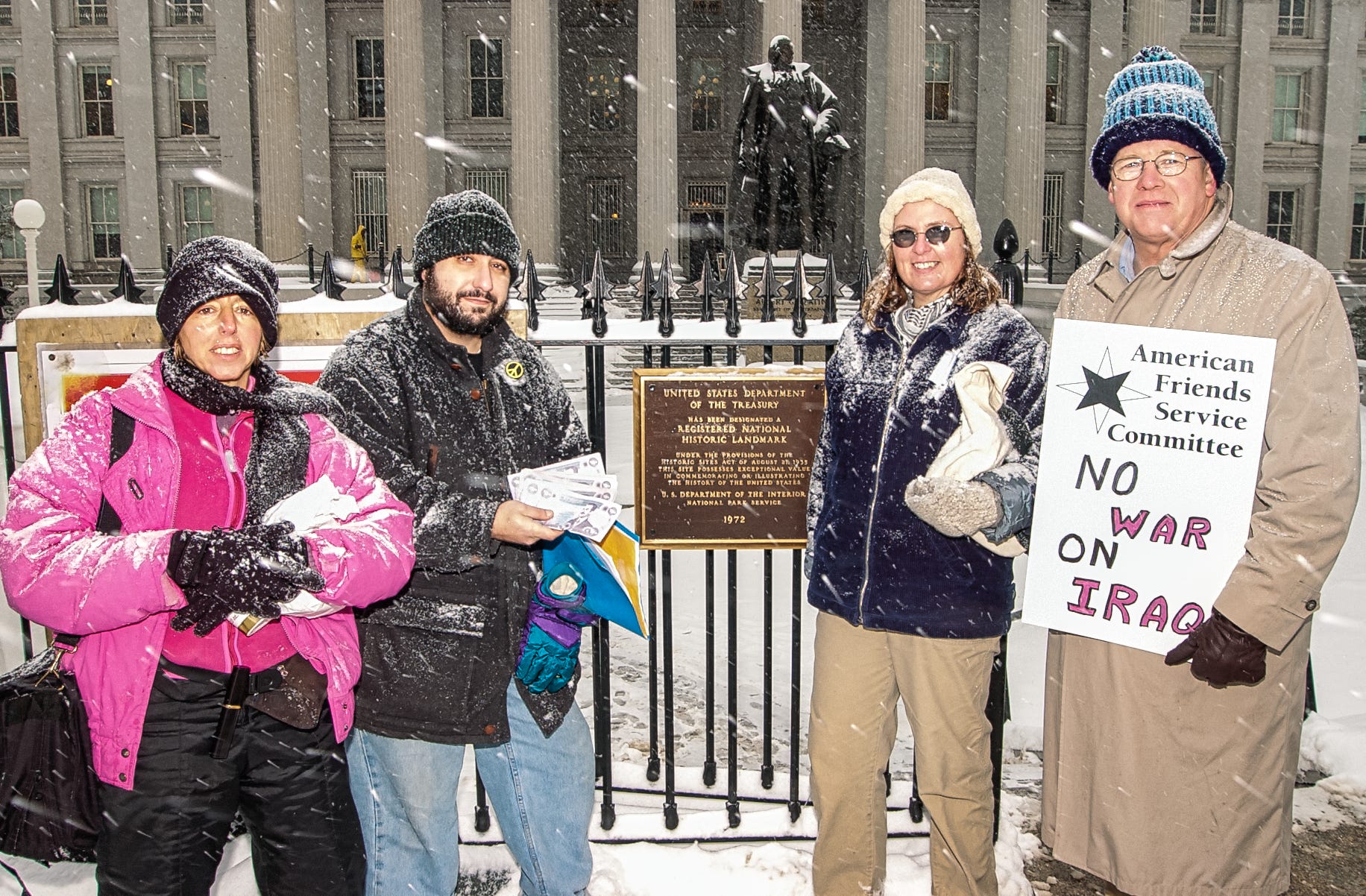 Я вперше зустрів Бенджамін у грудні 2022 року, щойно Code Pink була зареєстрована і прямо перед другою та більш тривалою фазою війни в Іраку. Вона, очевидно, була оштрафована урядом США за свій довоєнний візит до Іраку, і вона разом із трьома іншими особами прийшла до будівлі Міністерства фінансів у Вашингтоні під час рідкісно сильної снігової бурі зі жменею іракських динарів щоб сплатити цей штраф (все завжди зводиться до грошей) – зображення Саддама Хусейна виглядало з фіолетуватих купюр.