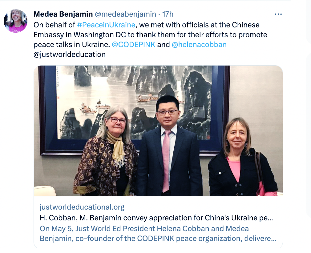 Наступного тижня, 10 та 11 червня, Бенджамін та Code Pink братимуть участь у Міжнародному саміті за мир в Україні у Відні, Австрія, конференції, на якій, як очікується, буде висвітлено позицію Китаю щодо України та закликатиме до негайного припинення вогню, за яким слідуватимуть «переговори», які по суті дозволять Росії зберегти території, які вона окупувала, почекати кілька років, щоб переозброїтися, а потім відновити свій наступ на захід. Відлуння позиції Невілла Чемберлена із заяви «Мир нашого часу».